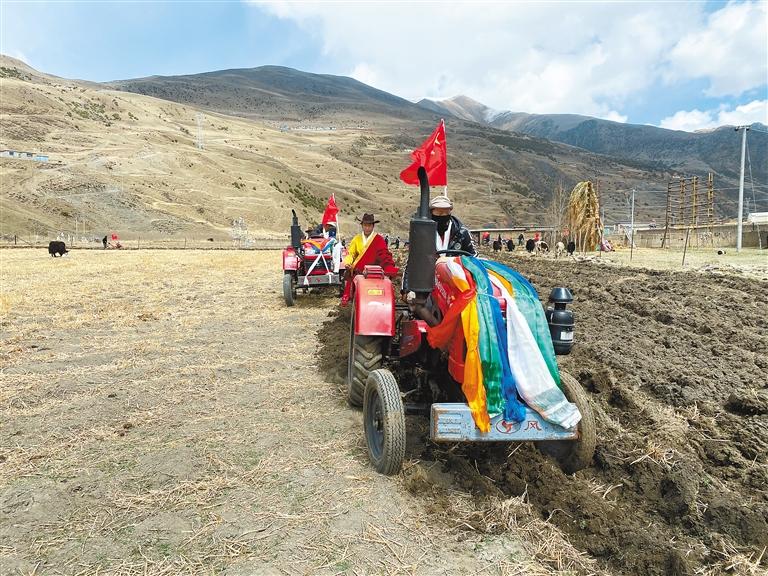 儀式現(xiàn)場,農(nóng)牧民群眾身著節(jié)日盛裝,帶著哈達(dá)、酥油茶等聚齊在田間舉行開犁儀式,祈禱全年風(fēng)調(diào)雨順、五谷豐登。懸掛著五星紅旗和黨旗的大型農(nóng)機具和拖拉機一字排開,在“轟隆隆”的響聲中,年輕的機手們開動拖拉機翻耕土地,婦女們熟練地躬身平土,土地逐漸變得平整松軟,一幅生機勃勃的“春耕畫卷”在加勤鄉(xiāng)的土地上徐徐展開。