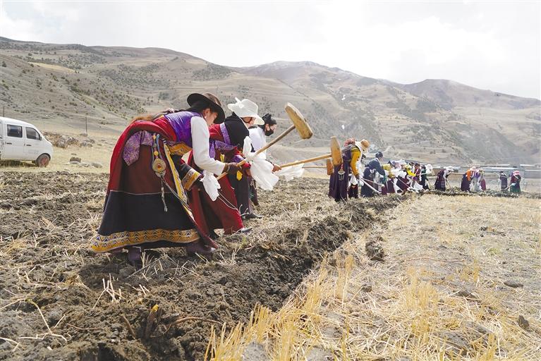 婦女們在平整田地。記者 曲珍 通訊員 益西卓瑪 攝