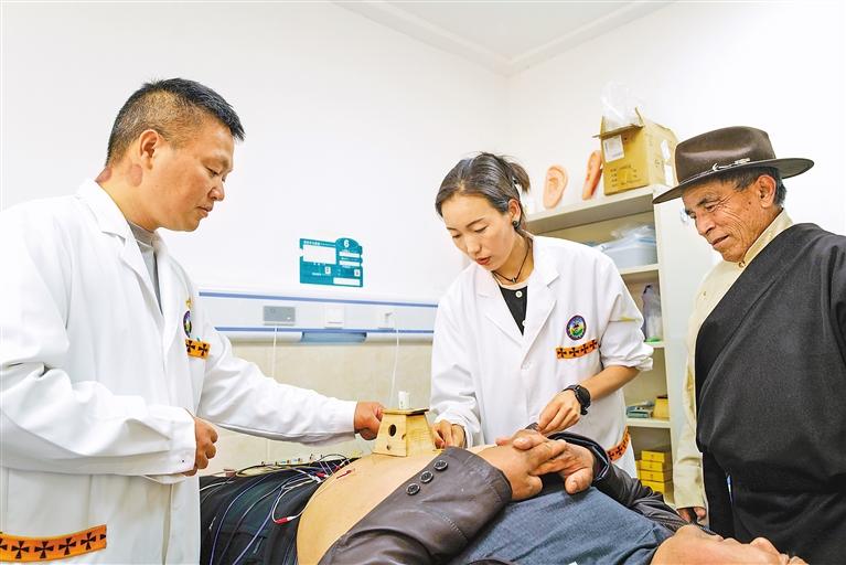 圖為在昌都市察雅縣藏醫(yī)院,重慶市大足區(qū)人民醫(yī)院援藏醫(yī)生(左)與藏醫(yī)院醫(yī)生結(jié)合中醫(yī)與藏醫(yī)療法,為患者進行診治。記者 丹增群培 攝