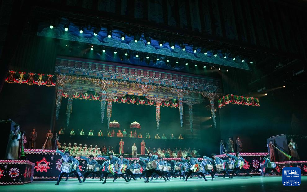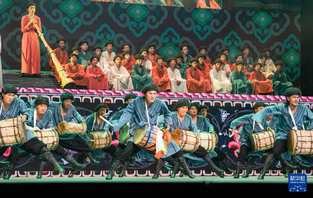 7月19日,在西藏拉薩《緣起象雄·古格遺風(fēng)》情景歌舞詩演出現(xiàn)場,演員在表演節(jié)目《鼓樂喧天》。新華社發(fā)(格桑雍珍 攝)