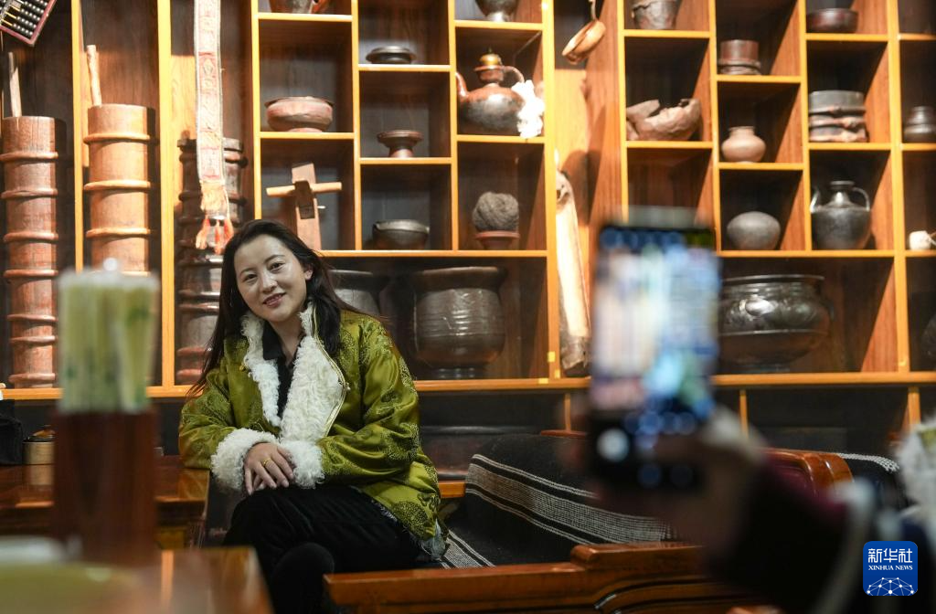 一名顧客在“牧人寶庫(kù)”茶館拍照留念(2月13日攝)。新華社記者 晉美多吉 攝