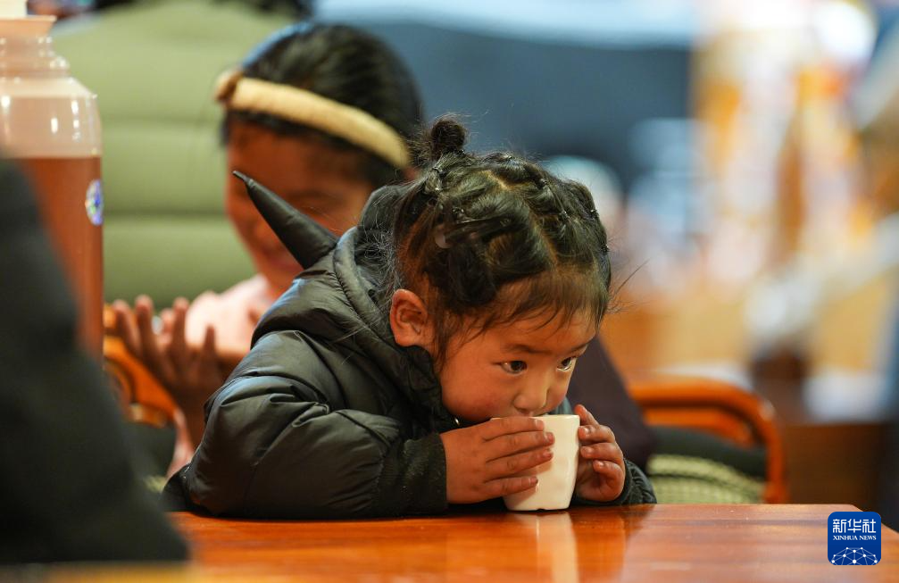 小顧客在“牧人寶庫(kù)”藏式茶館喝酥油茶(2月13日攝)。新華社記者 晉美多吉 攝