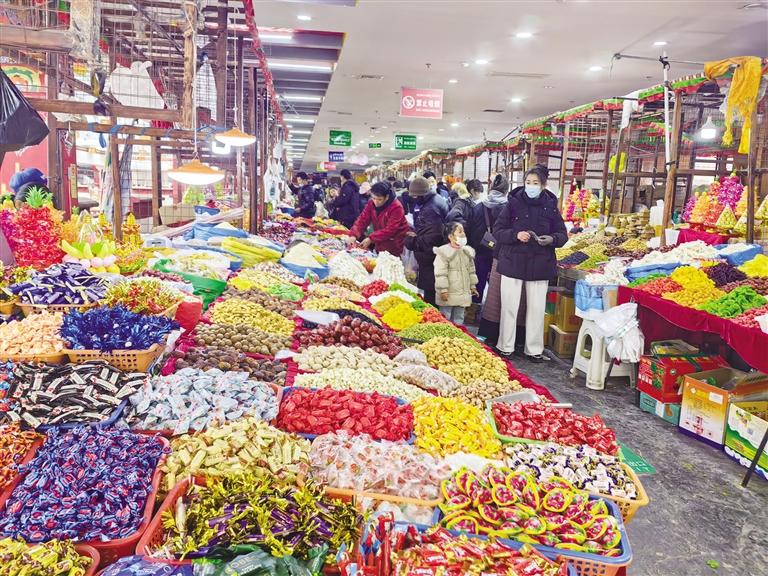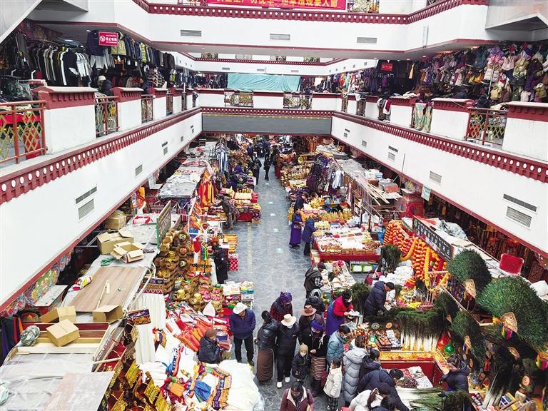春節(jié)過后,藏歷新年即將到來。北京東路上,熙熙攘攘的人群和商販的叫賣聲交織在一起,整個(gè)拉薩街頭洋溢著濃濃的節(jié)日氛圍。2月19日,記者來到八廓商城,從一樓到三樓,前來采購年貨的人絡(luò)繹不絕,對(duì)聯(lián)、酥油花、糖果、酥油……各類年貨琳瑯滿目,應(yīng)有盡有。