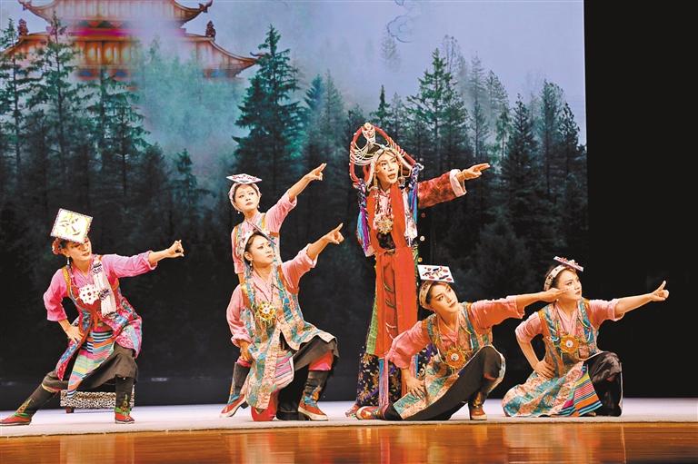 平珍(右三)表演藏戲《卓娃桑姆·尋王》舞臺照。 圖/文 記者 曉勇 見習(xí)記者 馮琳琳