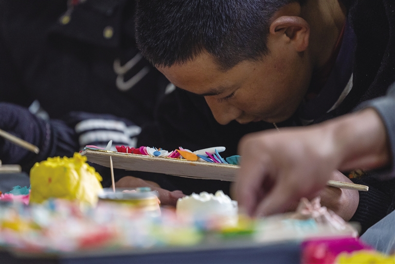記者看到,捏酥油花的主要工序十分復(fù)雜。藝人們先制作盾形木板作為酥油花的“骨架”,支撐著整個作品的形態(tài)。當(dāng)天,在幾十平方米的出租屋內(nèi),大家圍坐在墻邊,面前擺放著調(diào)制好的各色酥油和一盆盆清水。藝人們盤腿而坐,進(jìn)入“敷塑”階段:他們在加工成膏狀的乳白色酥油中揉進(jìn)各色礦物質(zhì)顏料,調(diào)和成五顏六色的油塑原料,接著熟練地捏取酥油在冷水中浸泡,然后用指尖不斷揉捻、塑形,不時還用小木刀進(jìn)行精細(xì)加工。隨后,在做好的酥油花上微灑清水,使其更加堅固且璀璨奪目。在他們的巧手下,一塊塊酥油很快就變成了日月、花瓣以及猴、象、兔、鳥等各種形狀。為了防止酥油融化,他們不停地將手放入冰水中降溫。
