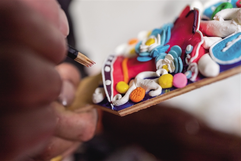 “今年是木蛇年,我們會依據(jù)當(dāng)年的屬相制作一些定制款。每個人的手感不同,做出來的酥油花都是獨(dú)一無二的?!崩习甯裆=榻B道,“制作酥油花的過程很重要,尤其是選酥油。如果用平時吃的酥油很容易化掉,我們需要挑選白色的酥油。每個酥油花的寓意不同,我們做的種類也會更加豐富?!?/p>