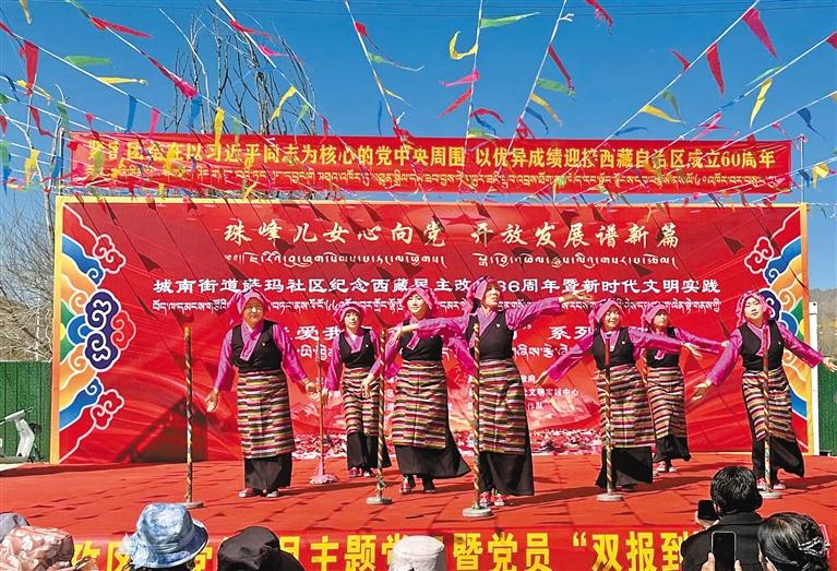 3月28日,日喀則市桑珠孜區(qū)城南街道薩瑪社區(qū)舉行紀(jì)念西藏民主改革66周年暨新時(shí)代文明實(shí)踐“我愛我家 幸福日喀則”活動演出現(xiàn)場。通訊員 次旦玉珍 攝