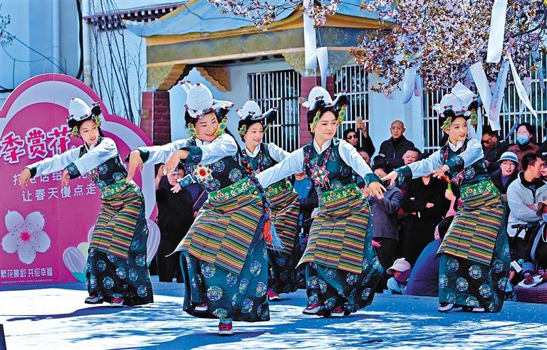 3月27日,“繁花映彩 共繪幸?!笔讓梦幕囆g(shù)周暨 “3·28”西藏百萬農(nóng)奴解放紀(jì)念日活動在拉薩市城關(guān)區(qū)軍民路開幕。圖為活動現(xiàn)場歌舞表演。記者 王敏 攝