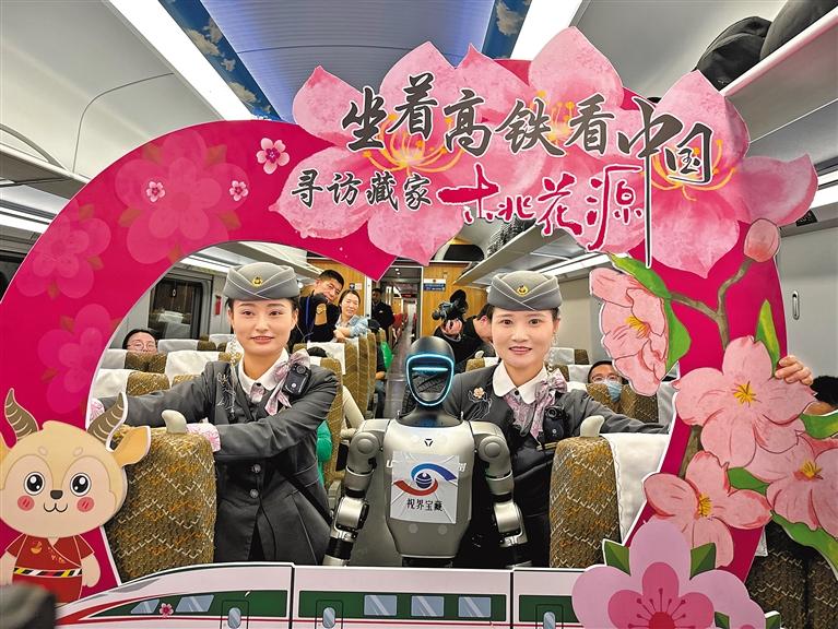圖為拉林鐵路復(fù)興號(hào)動(dòng)車組乘務(wù)員與機(jī)器人多吉合影。記者 文鳳 通訊員 馬生明 攝