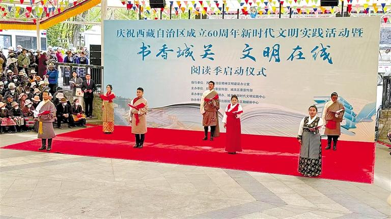 圖為4月23日,慶祝西藏自治區(qū)成立60周年新時(shí)代文明實(shí)踐活動(dòng)暨“書(shū)香城關(guān) 文明在線(xiàn)”閱讀季啟動(dòng)儀式在拉薩市宗角祿康公園舉行。圖為城關(guān)區(qū)基層宣講員朗誦《向著太陽(yáng)升起的地方》。記者 格桑倫珠 趙文慧 攝