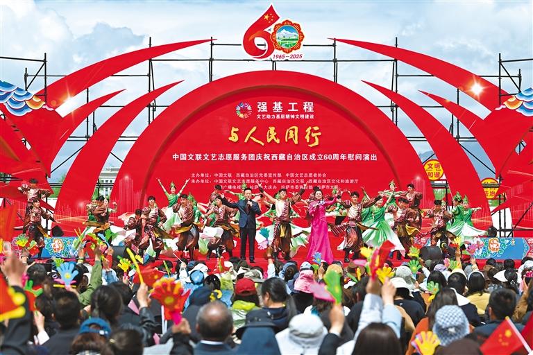 上午10時整,“與人民同行”中國文聯(lián)文藝志愿服務團慶祝西藏自治區(qū)成立60周年慰問演出,在歌舞《鼓舞西藏》的熱烈氛圍中正式開場。