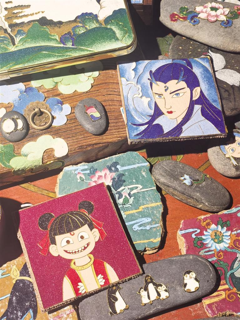只見占地不到20平方米的小屋內(nèi),擺放著各類唐卡畫作。既有傳統(tǒng)唐卡作品,亦有動畫人物的“繪像”。描邊的金屬絲和光滑的質(zhì)感表面讓人忍不住駐足欣賞。店里陳列著巴掌大小的掐絲唐卡,金線掐絲在礦物顏料映襯下流光溢彩。畫師兼老板的南吉合多杰正在完成一份岡仁波齊的客單:“勉薩畫派的特色是線條細膩,顏色過渡自然。選好圖案后,會根據(jù)載體材質(zhì)、大小(例如石頭大小、木板長短等)收費?!彼贿呎f著,一邊用特制工具將顏料注入金絲隔斷。