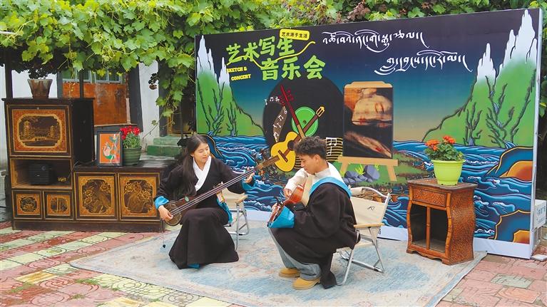 在音樂鑒賞環(huán)節(jié),拓崗扎念樂隊將傳統(tǒng)扎念琴演奏與現(xiàn)代音樂結合,表演了《卓木仁青崗》等曲目;青年歌手次仁羅布演唱藏族民歌,展現(xiàn)非遺特色。在藝術對談中,青年畫家雍忠卓瑪分享了自己克服身體障礙堅持創(chuàng)作的經歷,圍繞“自然與藝術的關系”展開討論,結合作品從藏族文化和鄉(xiāng)土景觀中獲取創(chuàng)作靈感的過程。在寫生體驗環(huán)節(jié),活動參與者以德慶鎮(zhèn)民居和周邊自然景色為素材進行創(chuàng)作,雍忠卓瑪從構圖、色彩運用等方面給予指導,幫助活動參與者完成10余幅繪畫作品。