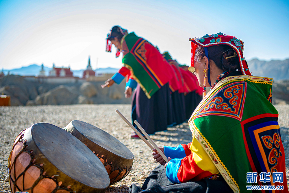 西藏自治區(qū)級(jí)“宣舞”非遺傳承人央金(右)在古格王國(guó)遺址腳下伴奏鼓樂(lè)(6月12日攝)。新華網(wǎng) 旦增努布 攝