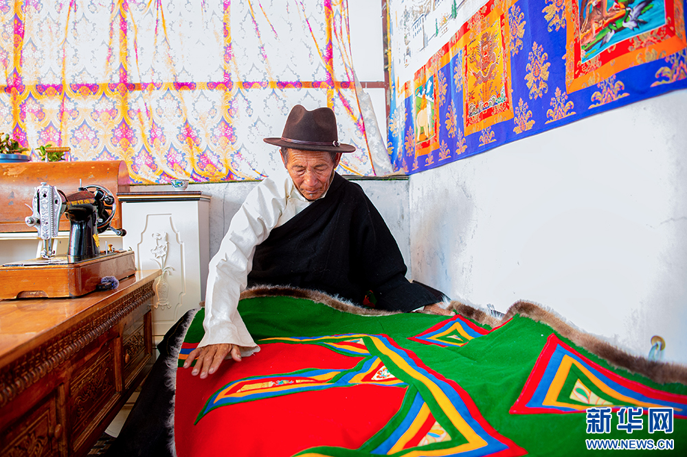 “噶爾傳統(tǒng)服飾”地區(qū)級(jí)代表性傳承人石達(dá)次仁在介紹自治區(qū)級(jí)非物質(zhì)文化遺產(chǎn)“噶爾傳統(tǒng)服飾”(6月14日攝)。“噶爾傳統(tǒng)服飾”由羊羔皮和呢子內(nèi)外兩面縫制而成,形狀為正方形,制作簡(jiǎn)易,內(nèi)里均為純白色的羊羔皮,羊羔皮既保暖又有裝飾性。新華網(wǎng) 旦增努布 攝