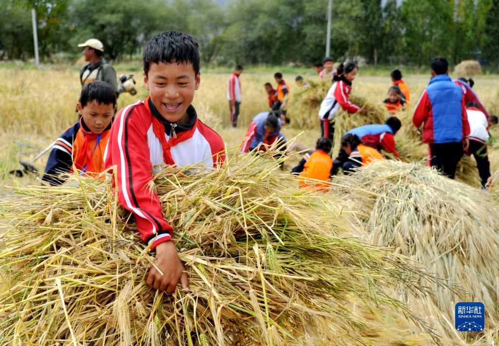 日喀則市上海實(shí)驗(yàn)學(xué)校的學(xué)生們?cè)谇囡乩飫趧?dòng)(9月17日攝)。新華社發(fā)(潘杰 攝)