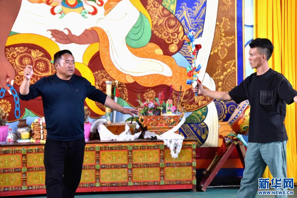 扎西曲登社區(qū)居委會(huì)主任尼瑪次仁(左一)指導(dǎo)年輕人排練藏戲(2021年7月15日攝)。新華社記者陳尚才 攝