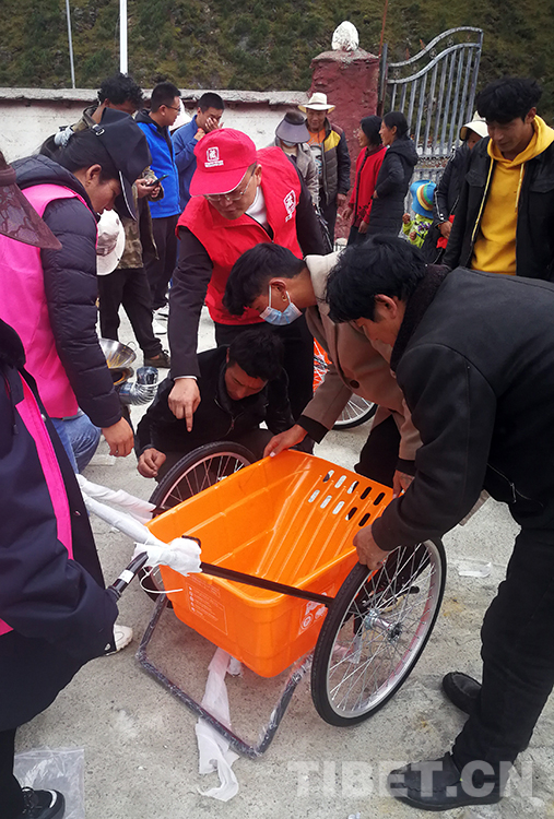 當(dāng)天的發(fā)放儀式上,共向索縣西昌鄉(xiāng)發(fā)放撿拾車(chē)200輛、鐵鍬200把、高原野炊灶鍋20個(gè)、牛糞商品編織袋2000個(gè)。我作為北京建藏援藏工作者協(xié)會(huì)新任秘書(shū)長(zhǎng)與志愿者們一起,向接受捐贈(zèng)的牧民群眾詳細(xì)介紹和演示撿拾車(chē)的組裝和使用技巧。