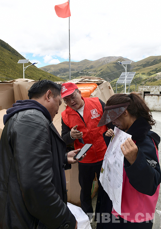 這是北京建藏援藏工作者協(xié)會(huì)志愿服務(wù)組人員張建(中)在西藏那曲市索縣西昌鄉(xiāng)指導(dǎo)牧民群眾用手機(jī)掃碼進(jìn)行高原撿拾車(chē)的視頻學(xué)習(xí)(唐召明2021年9月14日攝)
