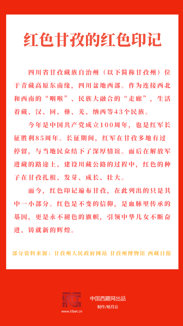 今年是中國共產(chǎn)黨成立100周年,也是紅軍長征勝利85周年。長征期間,紅軍在甘孜多地有過停留,與當?shù)孛癖娊Y(jié)下了深厚情誼。而后在解放軍進藏的路途上、建設川藏公路的過程中,紅色的種子在甘孜扎根、發(fā)芽、成長、壯大。