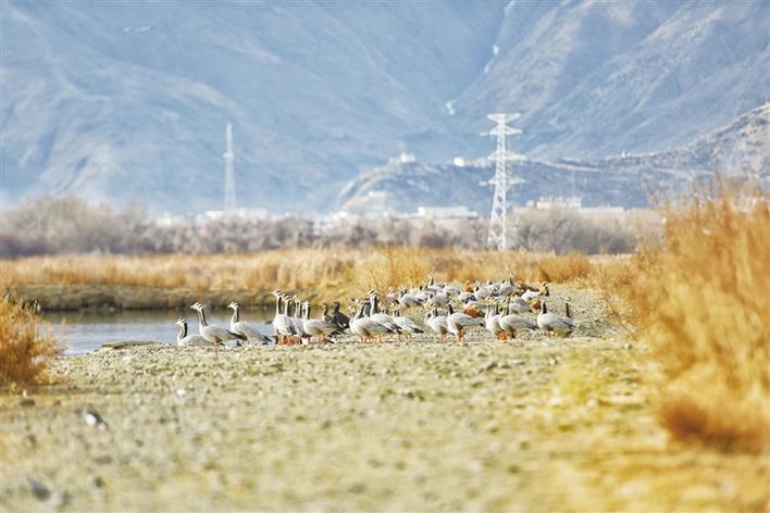 遠(yuǎn)處,連綿起伏的山頂還覆蓋著薄薄的積雪,布達(dá)拉宮雄偉而秀美;近處,濕地內(nèi)隨意顯現(xiàn)出的一塊塊水泊,成群的候鳥(niǎo)在水中玩耍嬉戲、在藍(lán)天白云下飛舞。見(jiàn)到可愛(ài)的飼養(yǎng)員帶來(lái)它們喜歡的麥粒,斑頭雁、紅隼、赤麻鴨、黃鴨等紛紛游上岸來(lái),盡情地享受美食,發(fā)出歡快的叫聲。