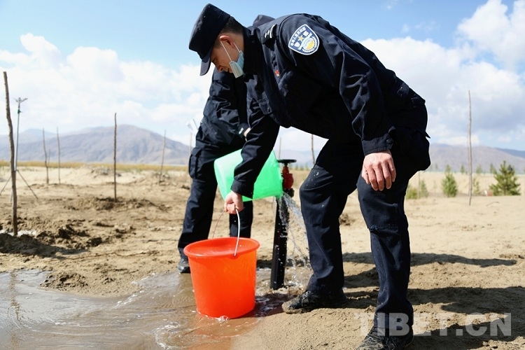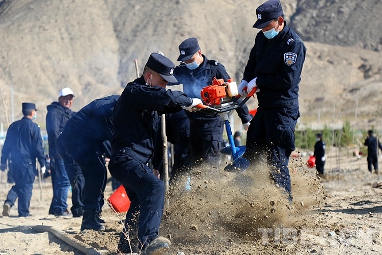 4月9日,民警們肩扛樹(shù)苗和鉆坑機(jī),手持鐵鍬和水桶,再次來(lái)到雅魯藏布江畔的沙漠地帶,開(kāi)展義務(wù)植樹(shù)公益活動(dòng)。
