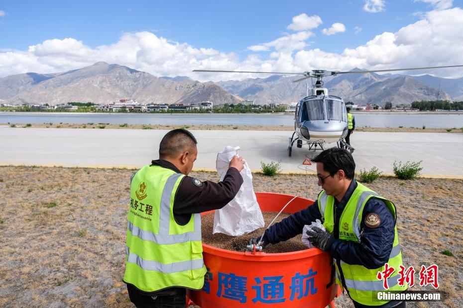 6月9日,西藏拉薩,拉薩雪鷹通航直升機從機場起飛前往造林點。當(dāng)日,西藏自治區(qū)林業(yè)和草原局在拉薩市組織開展首次飛播造林工作,此次飛播造林共設(shè)計9個飛播作業(yè)區(qū),其中拉薩市7個,山南市2個,由拉薩雪鷹通用航空公司負(fù)責(zé)飛機播種。設(shè)計飛播造林面積21.8萬畝,設(shè)計飛機播種沙棘、砂生槐等樹(草)種約119.3噸。中新社記者 何蓬磊 攝