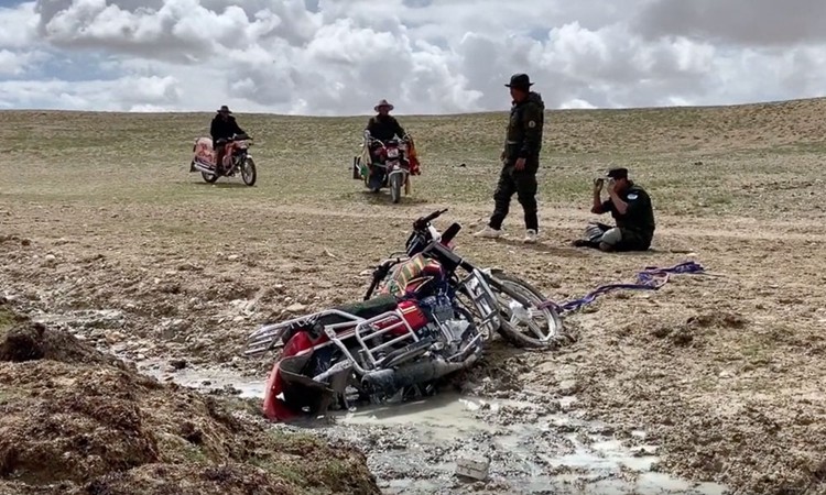 騎著摩托車行駛在草原上,危險(xiǎn)隨時都有可能發(fā)生。沒過多久,隊(duì)員們的一輛摩托車便陷入泥坑中,兩名隊(duì)員試圖將摩托車拽出來卻屢試無果。無奈之下只能打電話叫隊(duì)友過來幫忙,摩托車才得以脫困。類似的狀況,野保員們早已習(xí)以為常,簡單收拾之后,他們就又出發(fā)了。