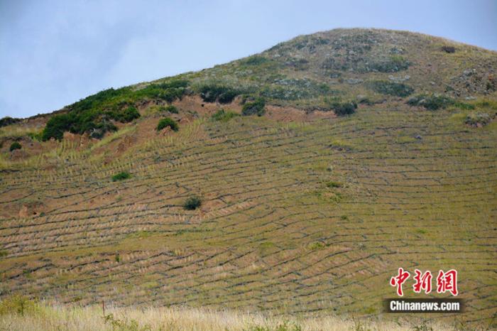 走進四川省阿壩州若爾蓋縣轄曼鎮(zhèn)西倉村治沙點,山坡上巨大的“棋盤”格外醒目??h林草局生態(tài)修復(fù)股助理工程師涂勝介紹,這是用于治理草原沙化的高山柳沙障。