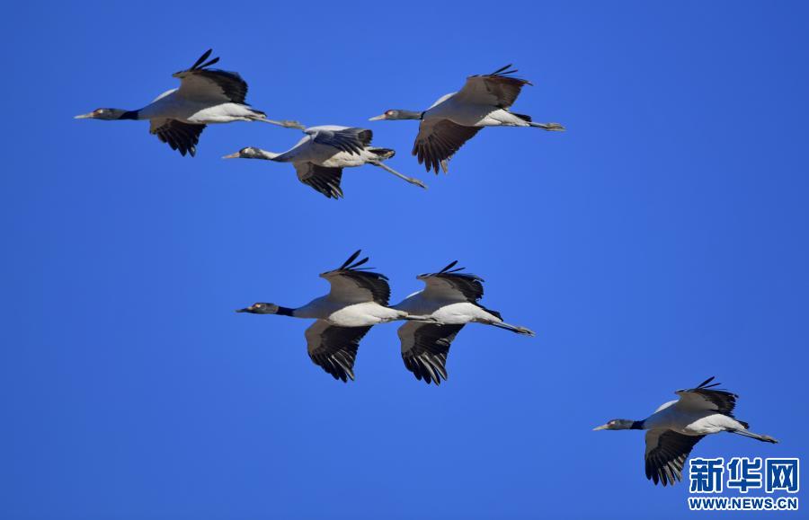 黑頸鶴在自然保護(hù)區(qū)里飛翔(2021年1月3日攝)。新華社記者 張汝鋒 攝