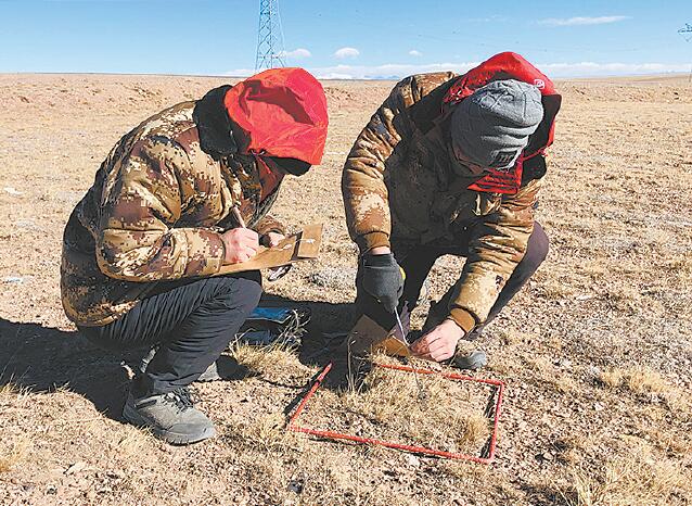 在另一塊平整的草地上,中科院西北高原生物研究所的賀福全和同伴正在采集植被樣本。賀福全說,他們的主要目標(biāo)是了解這個區(qū)域草的長勢情況,并將植被樣本帶回實(shí)驗(yàn)室進(jìn)行分析,針對這塊草地的承載能力,測量草地產(chǎn)量,給直升機(jī)和無人機(jī)做地面驗(yàn)證工作。