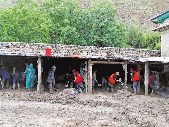 圖為林芝市朗縣滾村“兩委”、駐村工作隊組織村民開展清理淤泥活動。 史金茹 攝