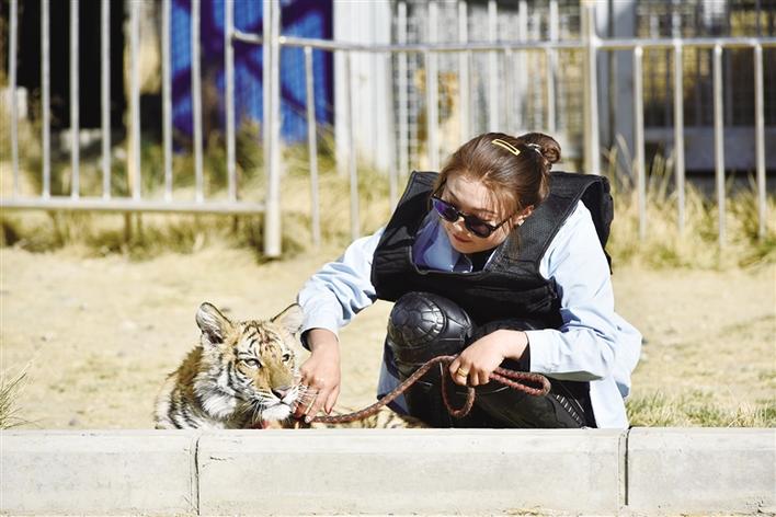 當記者看到四只幼獅時,它們時而聚在一起,時而沿著籠子邊溜達,時而張開大嘴向著外人示威,還有一個非?;钴S的在攀爬籠子。小老虎次仁卓瑪雖然沒有兄弟姐妹的陪伴,不過園區(qū)的獸醫(yī)小姐姐成了它最貼心的玩伴。每天,獸醫(yī)小姐姐都會帶著次仁卓瑪進行戶外活動,次仁卓瑪像小朋友一樣喜歡玩皮球,喜歡追著獸醫(yī)小姐姐跑,還特別喜歡獸醫(yī)小姐姐給它按摩,經常會撒嬌求抱抱。