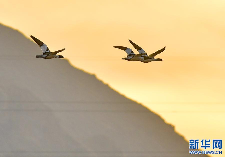 中華秋沙鴨在拉魯濕地上空飛翔(3月7日攝)。新華社記者 張汝鋒 攝