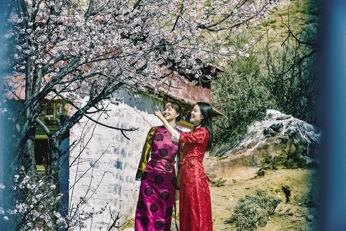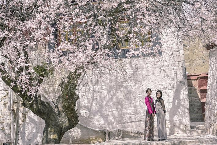 這里雖然沒有漫山遍野桃花次第盛開,但有花團錦簇、桃紅柳綠,幾棵桃樹,一陣春風(fēng)吹過,花瓣如雨。身著藏裝的姑娘,與桃花合影,共赴春天的約會,看上去頗有些妖嬈的味道。