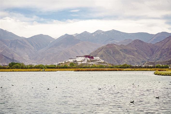 從拉薩市當(dāng)熱西路上向北望去,便能看到這塊北面靠山,東、南、西三面為市區(qū)包圍,面積12.2平方公里的濕地。遠處,連綿起伏的山頂還覆蓋著薄薄的積雪,布達拉宮雄偉而秀美;近處,濕地內(nèi)隨意顯現(xiàn)出的一塊塊水泊,成群的候鳥在水中玩耍嬉戲、在藍天白云下飛舞。拾階過橋,一條木質(zhì)長廊向濕地中延伸,只是我們這些不速之客的到來,驚起水鳥無數(shù)。它們仿佛商量好似的沖上藍天,讓人為打擾它們的棲息而不安。