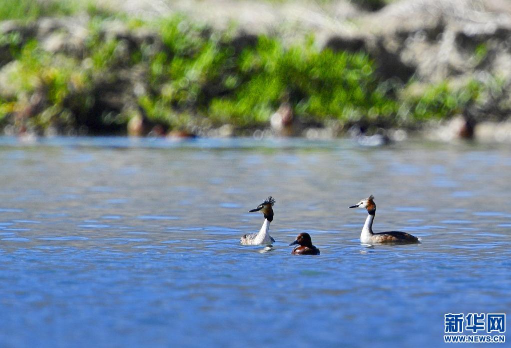 6月14日在拉魯濕地拍攝的兩只鳳頭??和一只小??(中)。新華社記者 張汝鋒 攝