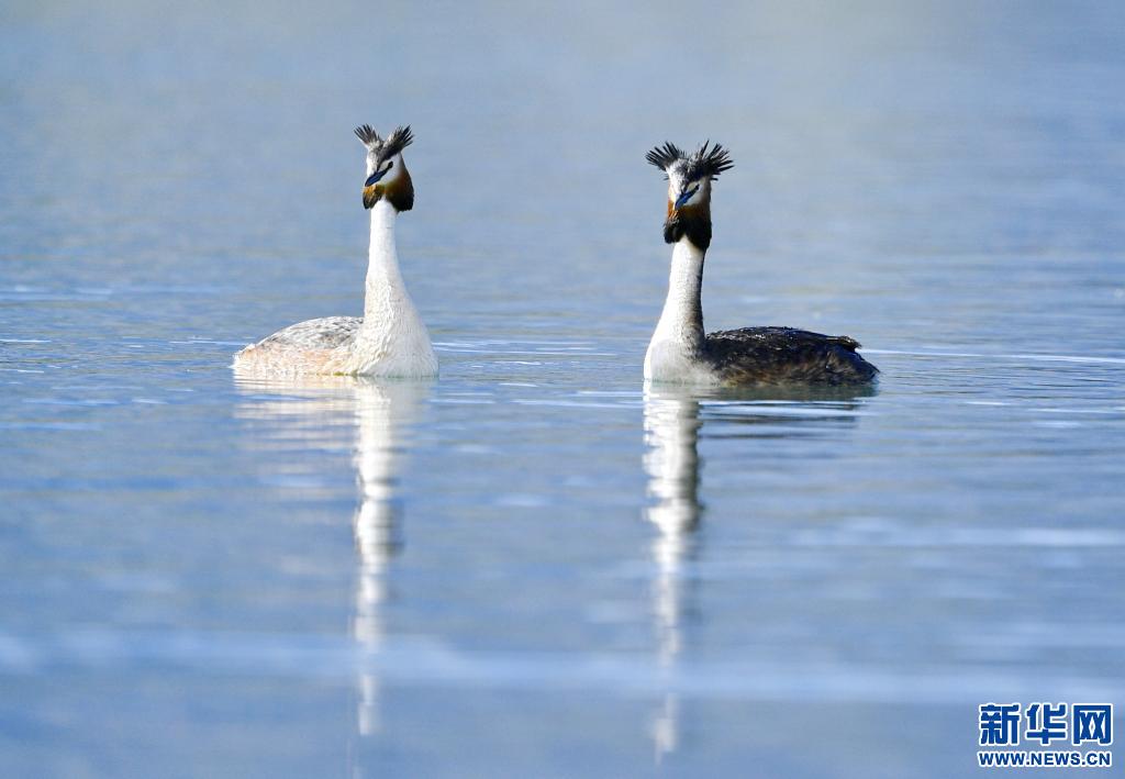 6月14日在拉魯濕地拍攝的兩只鳳頭??。新華社記者 張汝鋒 攝