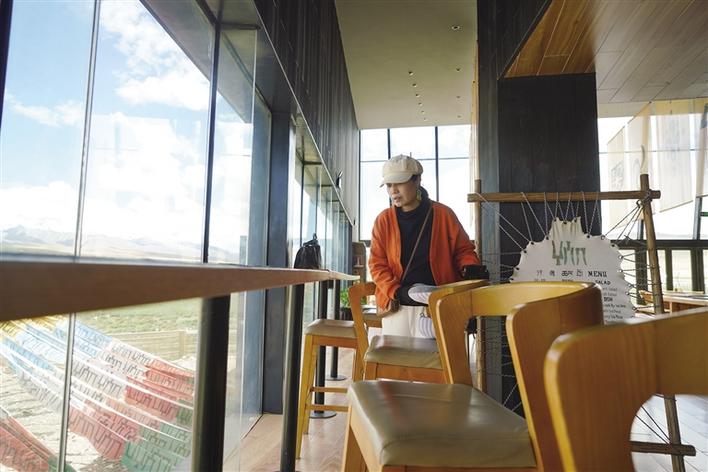 從正門進(jìn)入,穿過(guò)牦牛文化空間走廊,便可到能夠以最佳視角欣賞念青唐古拉山的VR觀景臺(tái)。緊鄰觀景臺(tái)右側(cè),是一間擺放當(dāng)?shù)匚膭?chuàng)產(chǎn)品、各類書籍的觀景咖啡廳。該咖啡廳的兩面墻體設(shè)計(jì)為超大落地窗,在此休息的游客可以邊品嘗咖啡,邊欣賞念青唐古拉山及拉多草原的美景。走進(jìn)咖啡廳,記者看到不少在這里休息的游客都在低頭寫著什么,經(jīng)咖啡廳負(fù)責(zé)人介紹:“這些游客是在寫明信片,我們這里不僅提供餐飲,還提供印有本地風(fēng)景的明信片,并同中國(guó)郵政合作,幫助游客按時(shí)將明信片寄到他們的親朋好友手中,讓游客們的旅途變得更有意義?!?/p>
