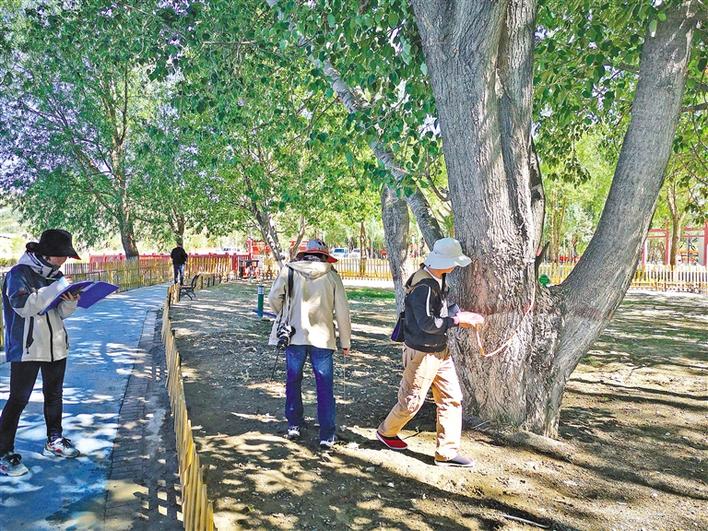 圖為西藏農(nóng)牧學(xué)院的師生在測算貢覺林卡內(nèi)古樹的相關(guān)數(shù)據(jù)。記者 扎西頓珠 攝