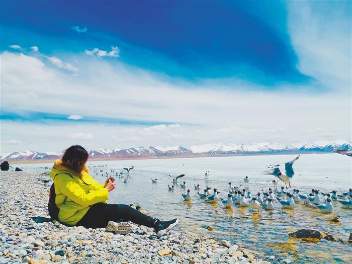圖為游客在納木錯邊拍攝紅嘴鷗。 記者 央金 攝