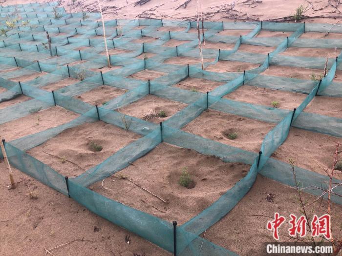 “傳統(tǒng)的方法是用廢樹枝等擺成方格等一定的形狀壓沙,里面再種上植物,效果很好但樹枝往往四五年就腐爛了;最近我們在嘗試推廣一種新型化學(xué)材料方格,成規(guī)??欤夷芫S持七到十年。”中國科學(xué)院西北生態(tài)資源研究院研究員常學(xué)向?qū)τ浾哒f。
