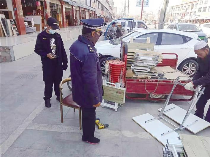 執(zhí)法人員對占道經營商戶進行勸說。圖由城關區(qū)城管局提供