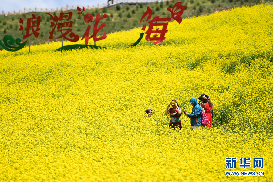游客在海北藏族自治州門(mén)源回族自治縣的油菜花田中拍照。新華社記者 吳剛 攝