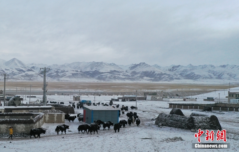 1月27日,當雄縣龍仁鄉(xiāng)烏達村牧民在雪中放牧。當雄縣位于西藏自治區(qū)拉薩市北部,距拉薩市區(qū)170公里?!爱斝邸保卣Z意為“天選牧場”,平均海拔約4200米,草場廣闊,土地肥沃。(無人機照片) 中新社記者 貢嘎來松 攝