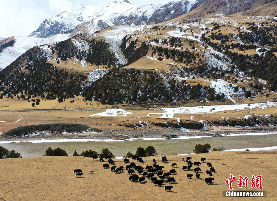 2月27日,一場(chǎng)降雪為青海省玉樹藏族自治州三江源國(guó)家公園瀾滄江源園區(qū)披上銀裝,藍(lán)天白云,雪山江河,牦牛在金燦燦的高山草場(chǎng)上悠閑散步,形成一幅幅多彩的生態(tài)美景圖。馬銘言 攝
