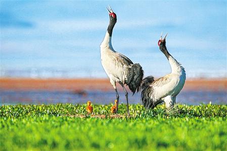 棲息在尕海濕地的國家一級保護(hù)動物黑頸鶴。 新甘肅·甘肅日報(bào)通訊員 張勇