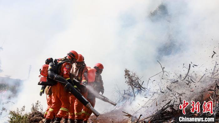 圖為3月2日,云南森林草原火災(zāi)應(yīng)急處置聯(lián)合實戰(zhàn)演練中常規(guī)裝備滅火。 云南省森林消防總隊 攝