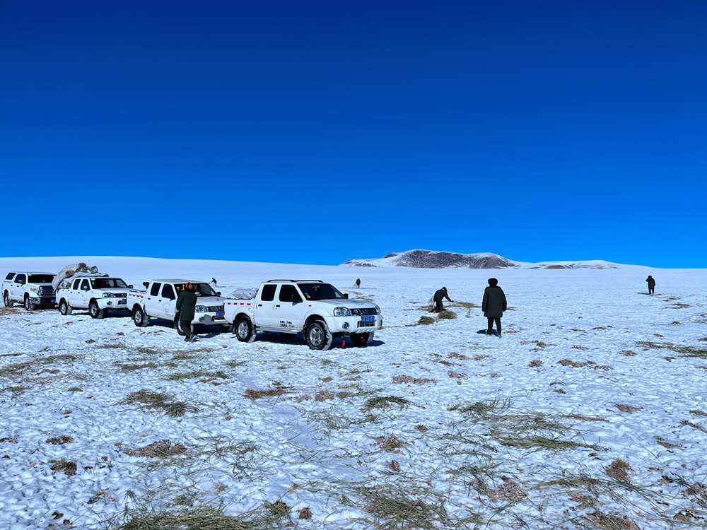 剛開始,管護(hù)員和林草局工作人員只投放了一半的干草到草地上?!霸蹅円彩堑谝淮胃桑l知道這些藏羚羊是否‘領(lǐng)情’?”仁增羅布笑著說。