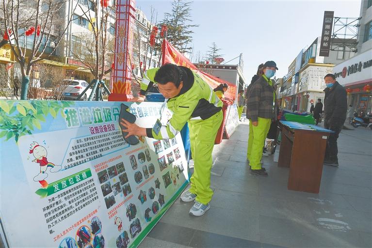 3月14日,西藏各市地紛紛開展春季愛國衛(wèi)生運動,廣大黨員干部群眾走上街頭,參與城市環(huán)境衛(wèi)生清潔。這是拉薩市垃圾分類宣傳活動現(xiàn)場。 記者 旦增蘭澤 攝